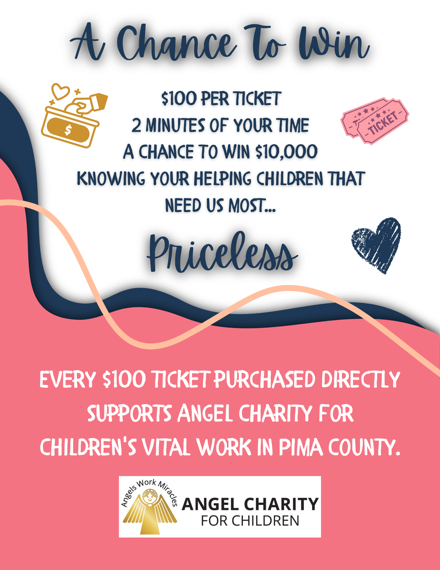 * Odds of winning are dependent upon the quantity of tickets sold. Angel Charity’s Chance Ticket Raffle is an Arizona raffle. All transactions take place in Arizona and are subject to Arizona Department of Gaming laws. Terms and conditions apply. Must be age 18 or older. Void where prohibited.